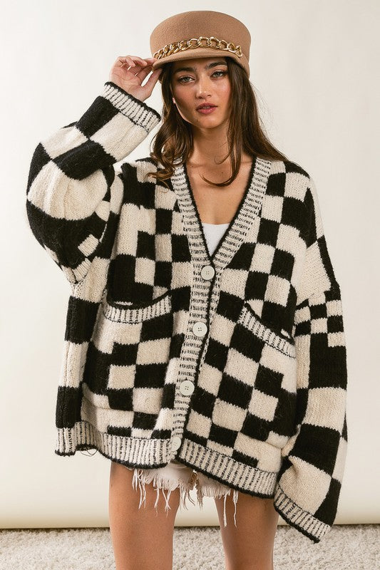 This stylish, contemporary cardigan features a classic checkered board-inspired knit design with a relaxed, oversized fit. The button-front closure, contrast trim, and functional front pockets make it the perfect combination of comfort and practicality.