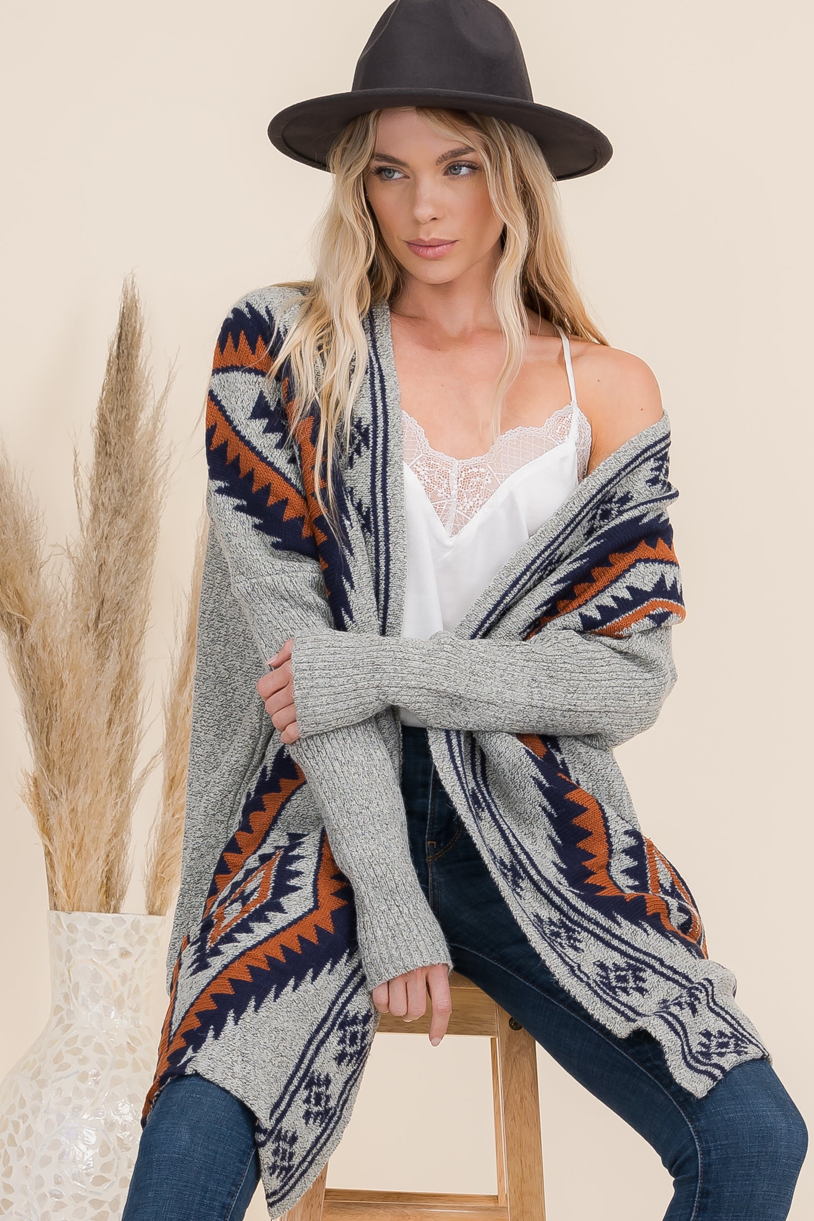 Transform your look with our stunning Aztec Pattern Knit Duster Cardigan, designed to offer the perfect blend of comfort and artistry. The western-inspired front adds a unique flair, while the open longline design makes it a versatile piece for any occasion. Elevate your wardrobe with this eye-catching cardigan that embodies the essence of boho fashion.