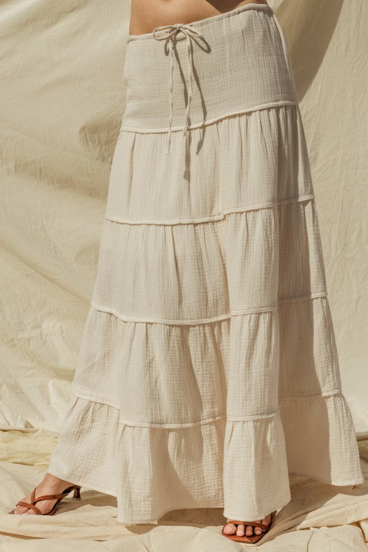 Embrace effortless style with our Flowy Tiered Ruffled Maxi Skirt, crafted from premium cotton gauze for a light and airy feel. This stunning skirt features a tiered silhouette with delicate pin tucks, making it a perfect addition to your warm-weather wardrobe.