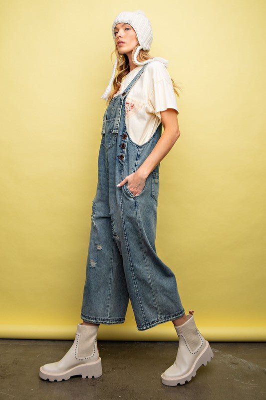 Chic Comfort with Our Distressed Denim Overalls!
