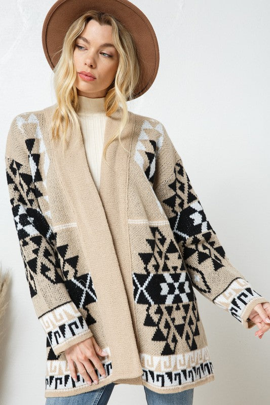 Aztec Print Inspired Boho Sweater Coat Jacket – Open Front Cardigan with Aztec Border Pattern"